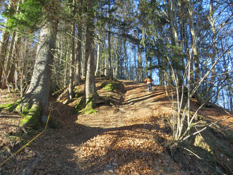 S planine sva odšla mimo več kotanj (so to mlake?) in odcepov, nato se je gozdna cesta začela zložno vzpenjati. Na obe strani se je odcepilo več kolovozov in stez, a midva sva se držala ceste. Na nekaterih drevesih ob njej so bili beli in zeleni listki in kartončki s številkami (enomestnimi od 1 navzgor in dvomestnimi od 33 navzdol). Ko