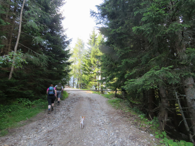 precej vzpenjati in po četrt ure nas je pri odcepu gozdne steze, po kateri smo gor grede nad