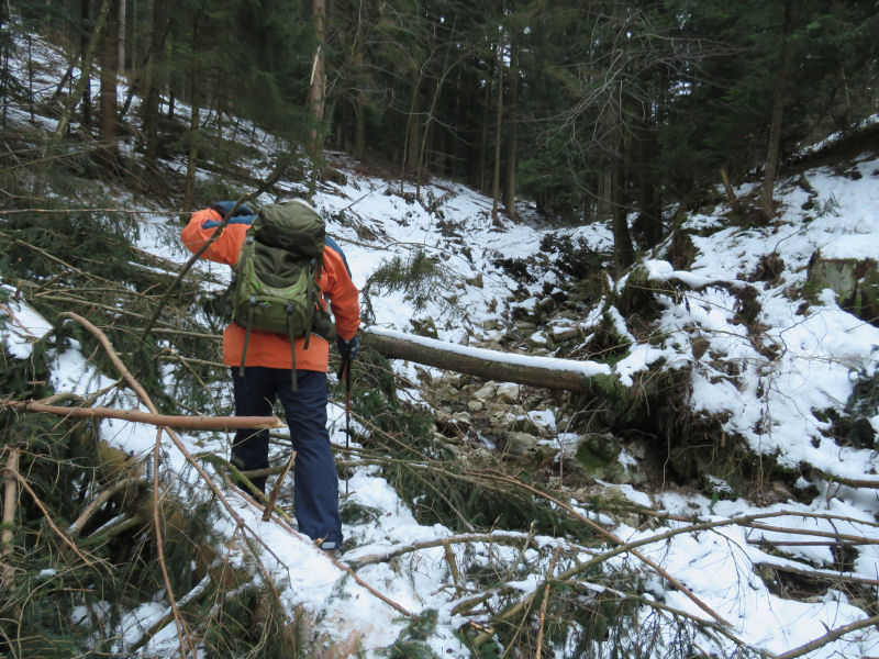 podrtega drevja. V bregu desno na drugi strani potoka sva skozi krošnje zaznala